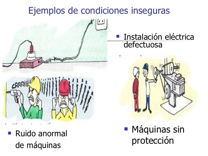 - Ejemplos de condiciones inseguras Instalación eléctrica defectuosa Ruido anormal de máquinas,Máquinas sin protección