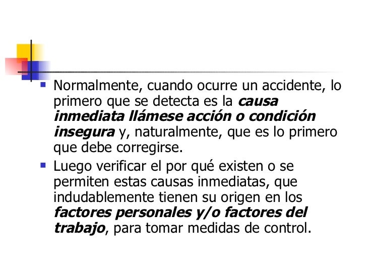 - Normalmente, cuando ocurre un accidente, lo primero que se detecta es la causa inmediata llámese acción o condición insegura y, naturalmente, que es lo primero que debe corregirse. Luego verificar el por qué existen o se permiten estas causas inmediatas, que indudablemente tienen su origen en los factores personales y/o factores del trabajo , para tomar medidas de control.