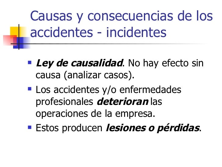 - Secuencia del accidente - incidente La Ley de causalidad nos indica que no hay accidentes sin causa. En consecuencia, deben determinarse el por qué ocurren estos hechos deteriorantes.
